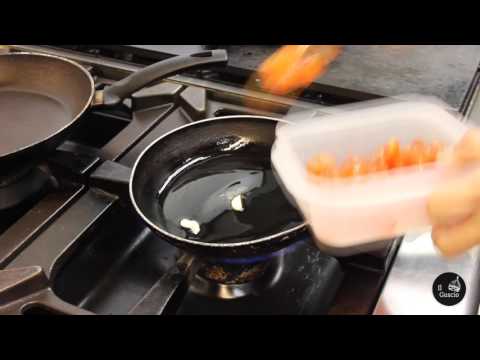 Scaldare la padella con olio e uno spicchio d’aglio schiacciato, nel mentre tagliare i pomodorini in quattro parti