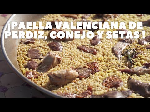 Paella Valenciana de setas, conejo y perdiz,.