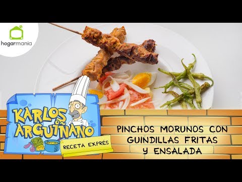 Receta de Pinchos morunos con guindillas fritas y ensalada