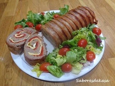 Rollo de carne picada relleno de tortilla y pimiento, bridado de beicon