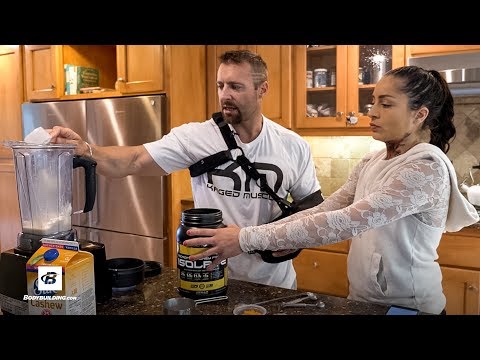 - 1In a blender, combine the almond milk, chocolate protein powder, brewed coffee, banana, almond butter, cocoa powder, and vanilla extract.