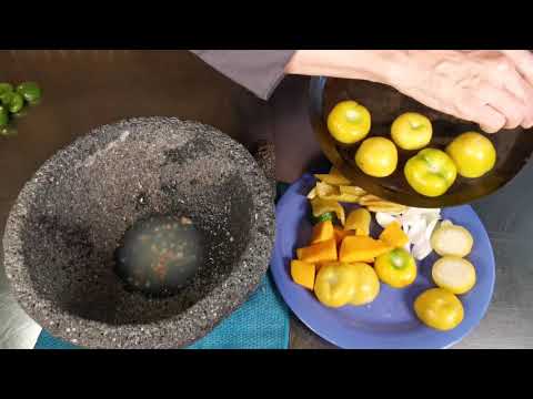 How to make Mexican Yellow Molcajete Salsa Sauce, with yellow Tomatillo, Mango, Chili & more