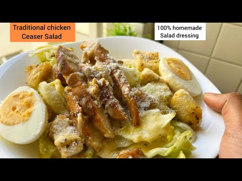 How to make easy & traditional Chicken ceasar salad with homemade salad dressing & croutons recipe