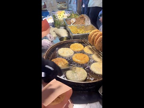Cooking deep fried pies with meat and chive fillings, Chinese street food.