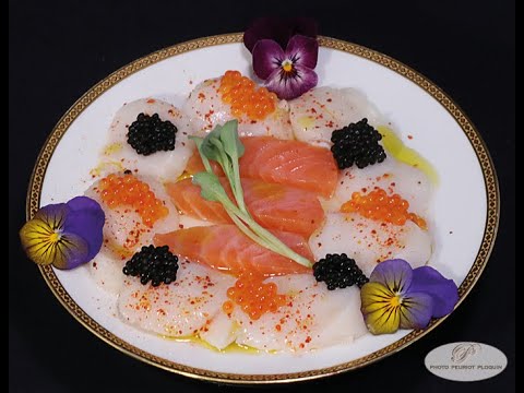 Carpaccio de noix de Saint-Jacques et saumon fumé, œufs de truite et perles de hareng fumé