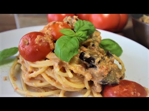 SPAGHETTI CREMA DI MELANZANE con RICOTTA E POMODORO FRESCO spaghetti con le melanzane SENZA FRIGGERE