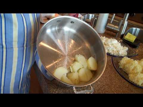 Peel and boil potatoes until tender, about 15-20 minutes.
