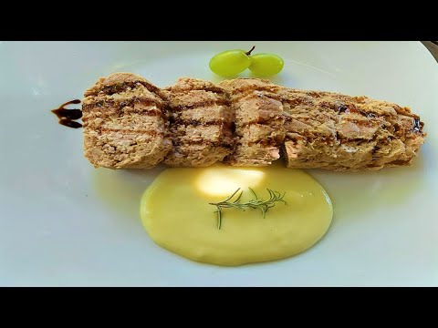 Rollo de carne relleno con salsa de aceitunas.