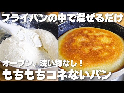 【材料3つ】フライパンの中で混ぜるだけ!サクサクもちもち。コネないパン作り方!【卵、バター、牛乳なし】