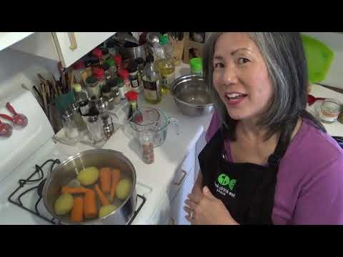 Boil the potatoes and carrots until tender, then cut them up and set aside.