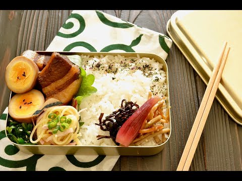 - 10Add braised pork and vegetables on top of the rice in the bento boxes.