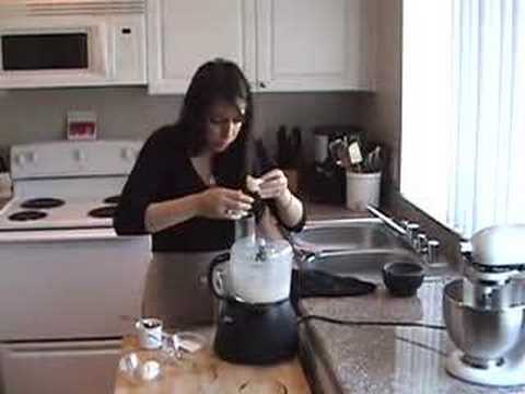 Turn on the food processor and begin adding the oil in a threadlike stream, starting with 1/2 cup of oil.