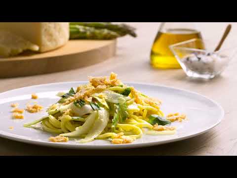 Insalata di tagliolini, Montasio, asparagi verdi e briciole di frico