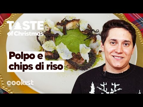 Polpo grigliato con crema di piselli e chips di riso: il secondo piatto per la cena di Natale